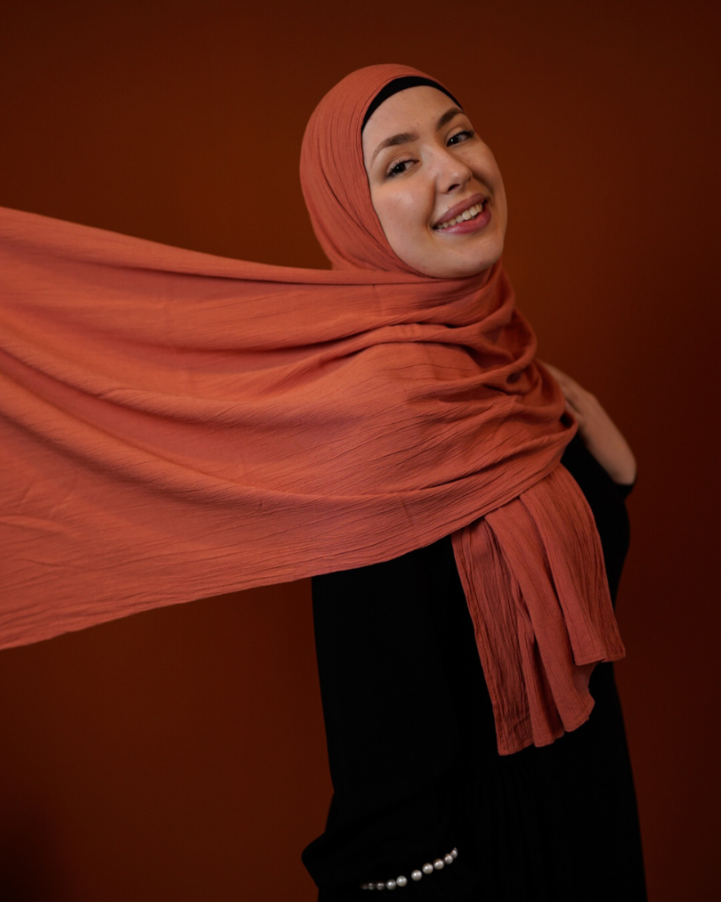 Crinkle chiffon hijab "Sandy" made of viscose and linen (Fox Red)